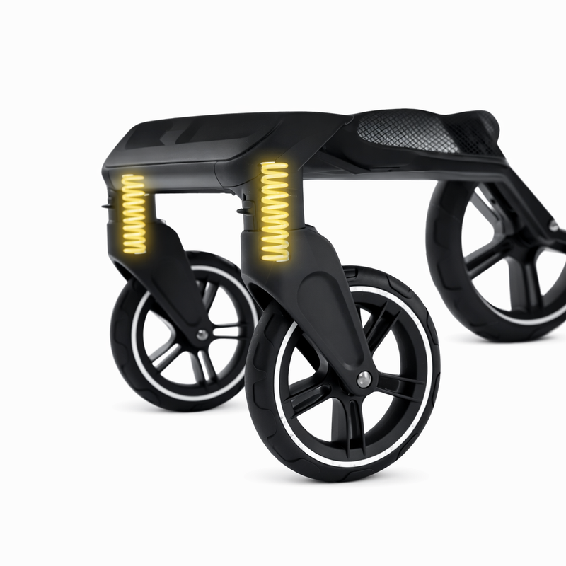 Fjädringen på framhjulen ger bättre stabilitet och förhindrar plötsliga stötar, vilket ger större komfort för ditt barn.