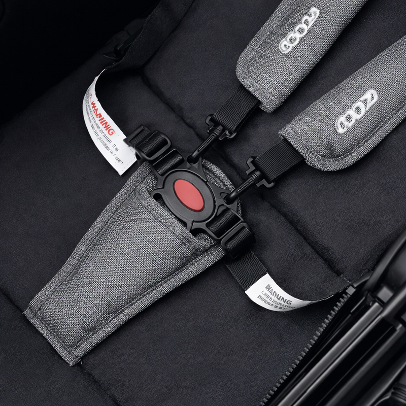 Barnvagnen är utrustad med ett 5-punkts säkerhetsbälte som ger barnet stabilitet och skydd under resan.