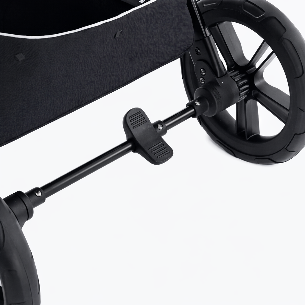 Barnvagnen är utrustad med en stark bakre fotbroms som möjliggör snabb och effektiv stoppning.