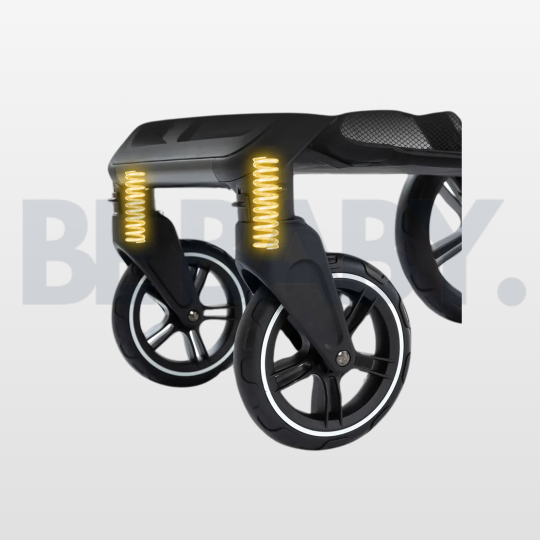 Voziček je opremljen s kakovostnim sistemom amortizacije, ki absorbira tresljaje in omogoča gladko ter udobno vožnjo tudi po neravnih poteh.