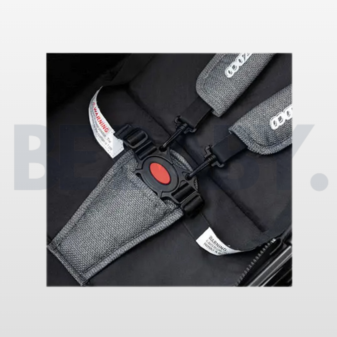Voziček je opremljen z 5-točkovnim varnostnim pasom, ki otroku zagotavlja stabilnost in zaŔčito med vožnjo.