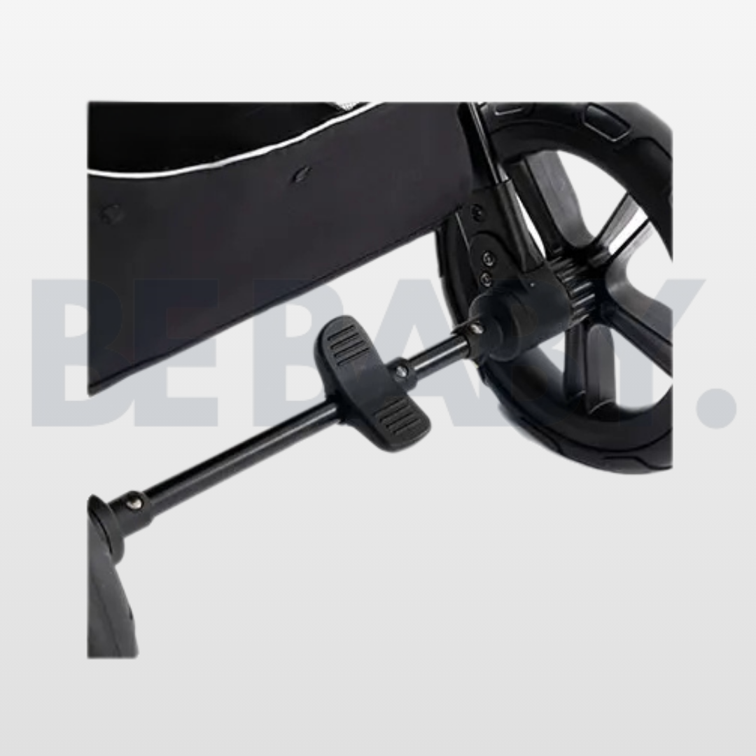 Voziček je opremljen z močno zadnjo nožno zavoro, ki omogoča hitro in učinkovito ustavljanje.