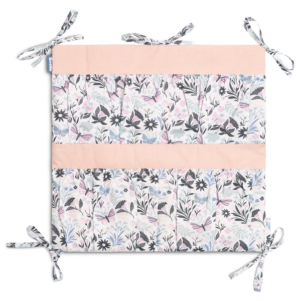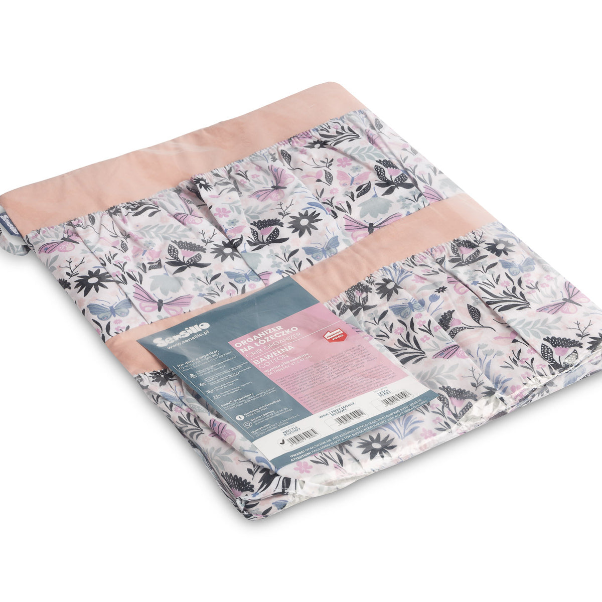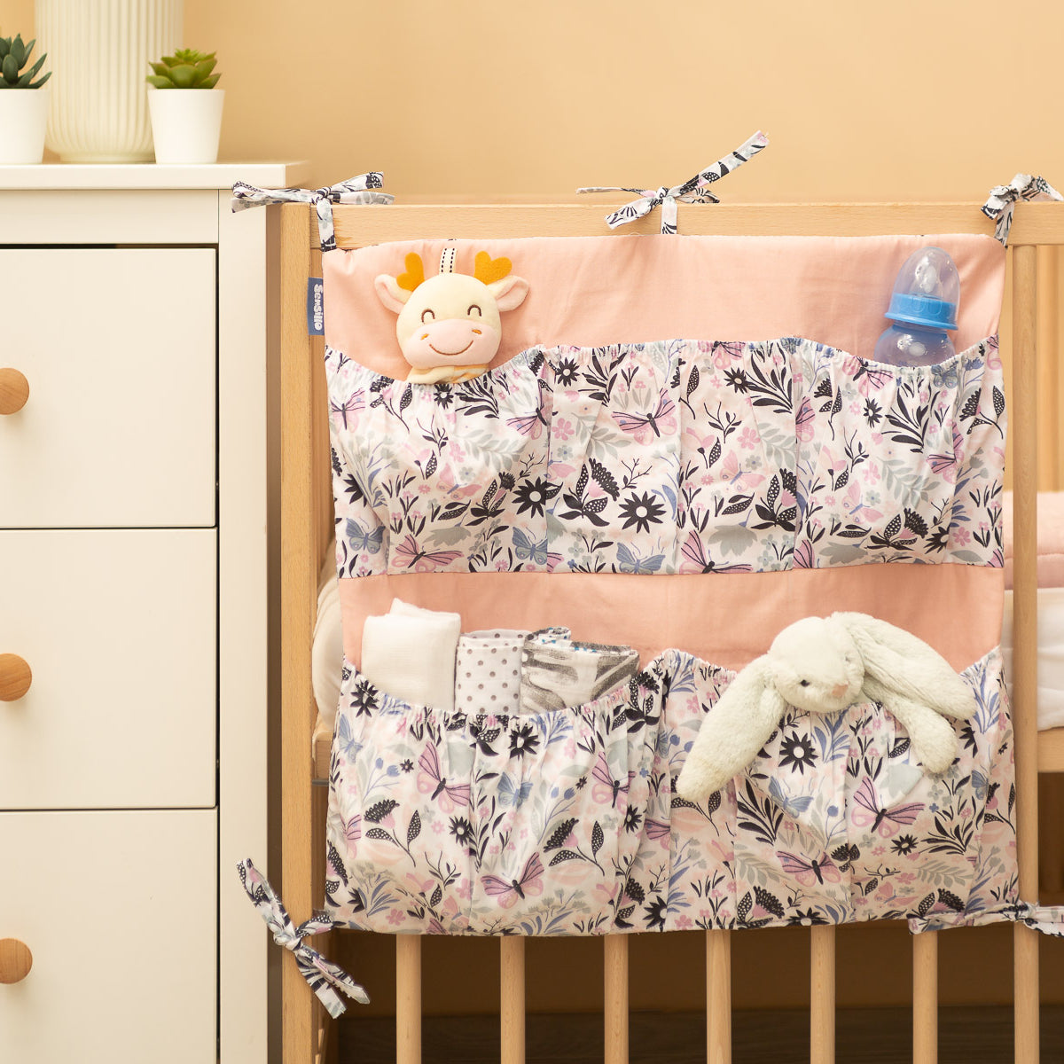 Organizator za posteljico ni le praktičen izdelek, ampak tudi okras dojenčkove sobe. Ima skupaj 5 žepov, ojačanih z elastiko, ki bodo sprejeli vse potrebne dodatke. Organizator se lahko enostavno namesti na okvir posteljice s pomočjo všitih trakov. Dodatno je ojačan s plastjo silikonskega flisa. Zunanjost je obrobljena s 100 % bombažem. Organizator se lahko kombinira z drugimi izdelki iz naše ponudbe.
